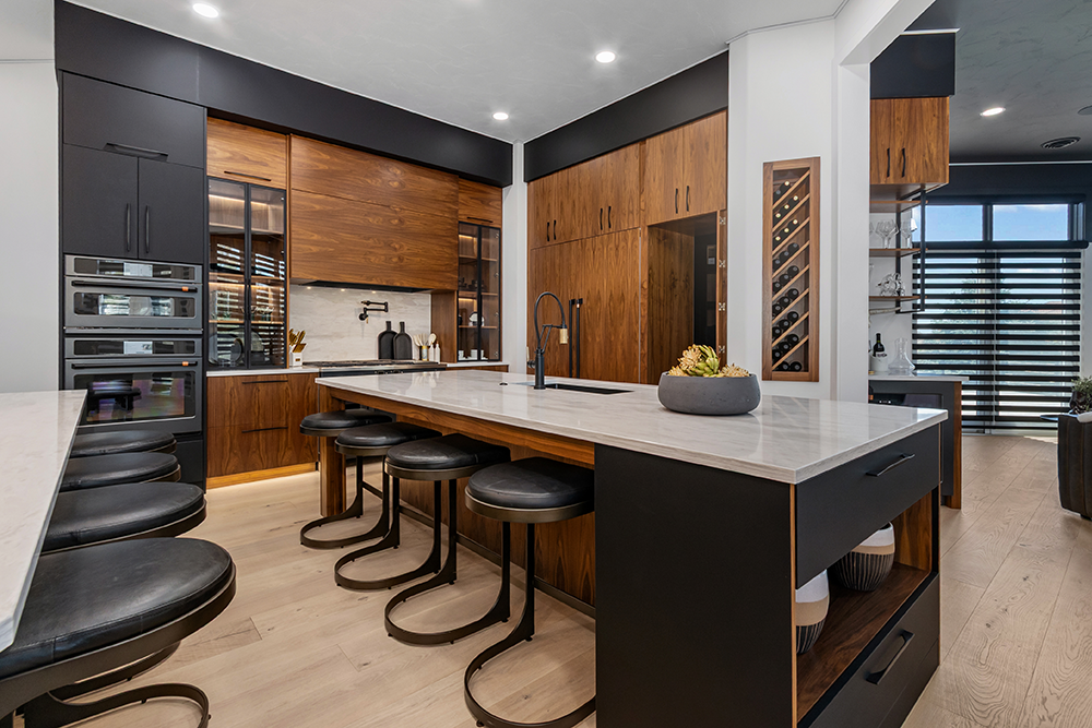 Walnut kitchen cabinets, double island, and hidden pantry